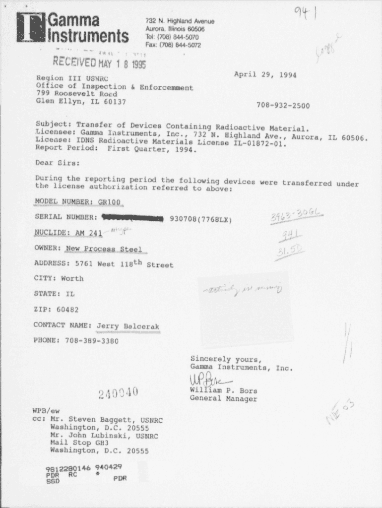 _ _ **.AQG.:Instruments.@732 N. Highland Avenue Auror2, Illinois 60506J.* $8)8 o Fax: (708) 8445072,, ,,,. , ’t(y h. Received MAY 181995\'April 29, 1994Region III USHRCOffice of Inspection & Enforcemment799
