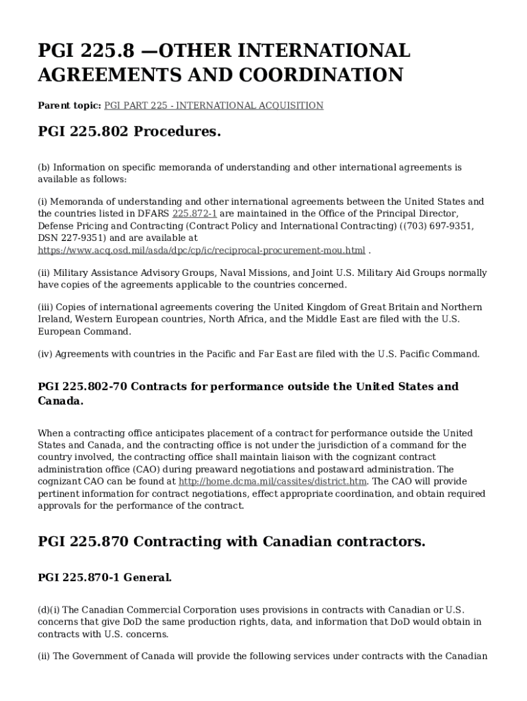PGI 225.8 OTHER INTERNATIONAL AGREEMENTS AND COORDINATION Parent topic: PGI PART 225 INTERNATIONAL ACQUISITION PGI 225.802 Procedures. (b) Information on specific memoranda of understanding and other