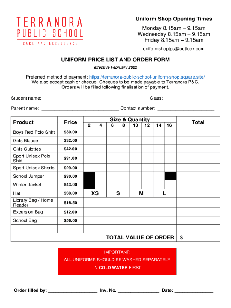 Uniform Shop Opening Times Monday 8.15am 9.15am Wednesday 8.15am 9.15am Friday 8.15am 9.15am uniformshoptps@outlook.comUNIFORM PRICE LIST AND ORDER FORM effective February 2022Preferred method of