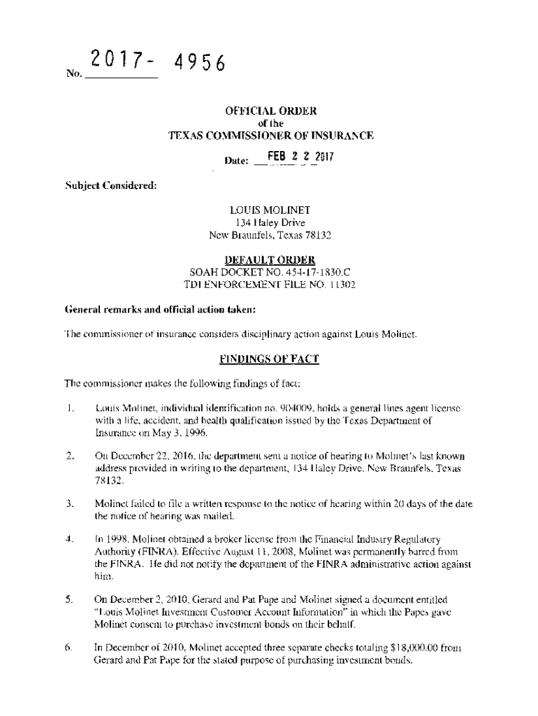 2017 4956No. _ _ _ _ __OFFICIAL ORDER of the TEXAS COMMISSIONER OF INSURANCE Date:_F_E_B_2_2_2017Subject Considered:LOUIS MOLINA 134 Haley Drive New Braunfels, Texas 78132 DEFAULT ORDER SOAP DOCKET