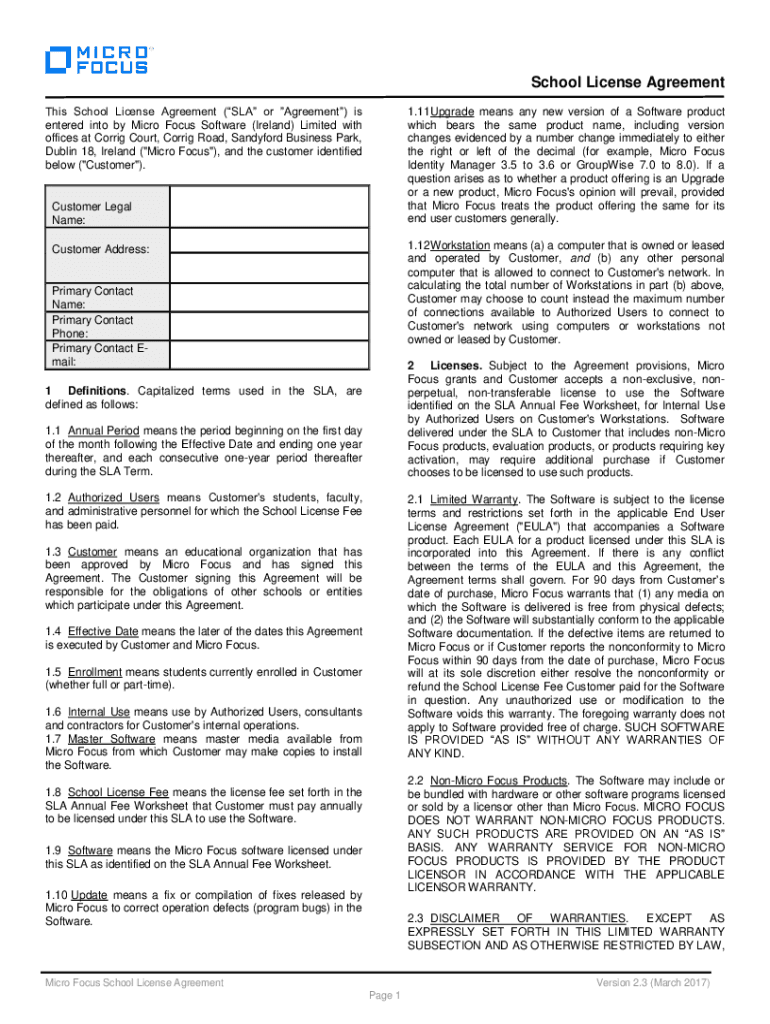 School License Agreement This School License Agreement (SLA or Agreement) is entered into by Micro Focus Software (Ireland) Limited with offices at Corrie Court, Corrie Road, Sandy ford Business Park,