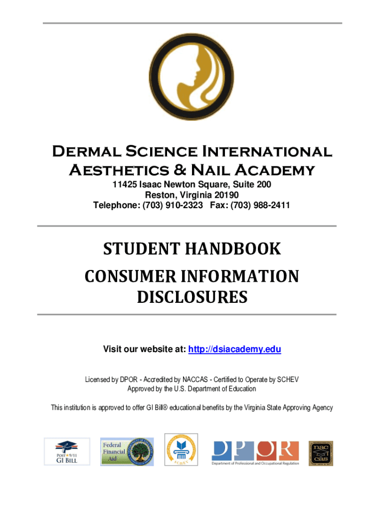 Dermal Science International Aesthetics & Nail Academy 11425 Isaac Newton Square, Suite 200 Reston, Virginia 20190 Telephone: (703) 9102323 Fax: (703) 9882411STUDENT HANDBOOK CONSUMER INFORMATION