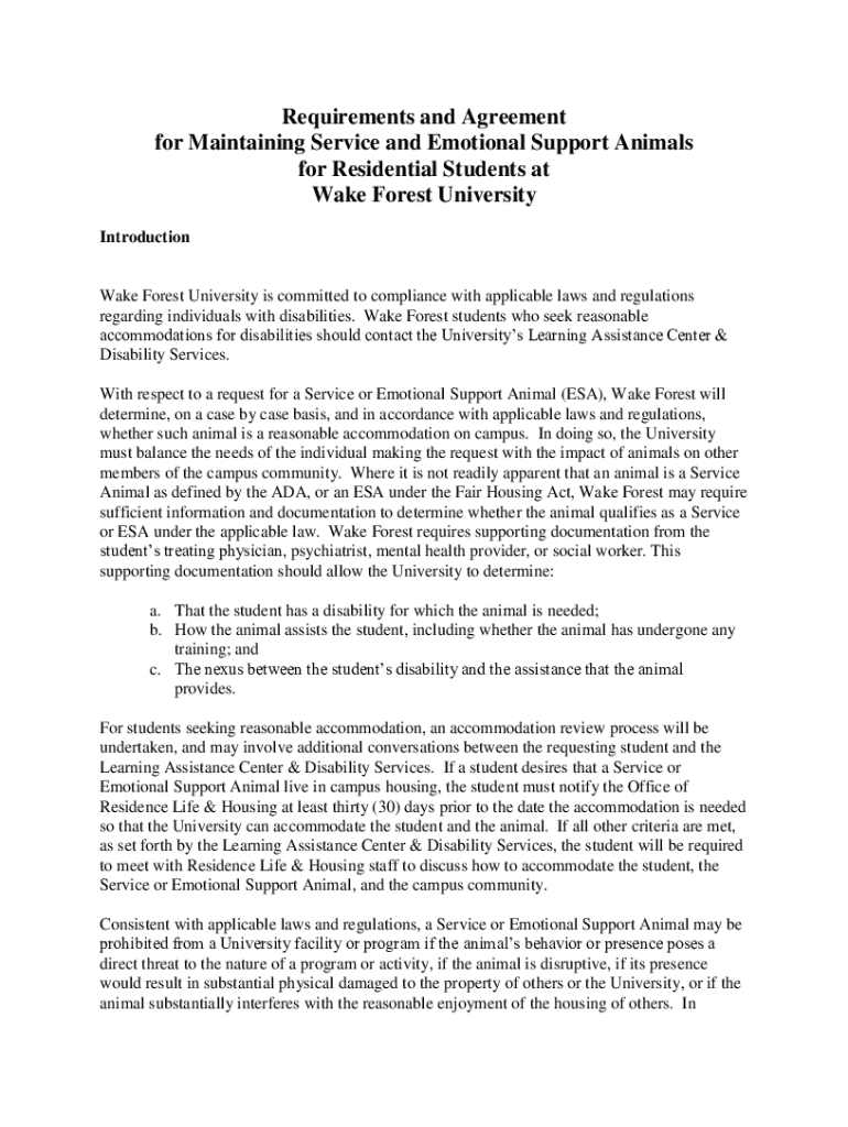 Requirements and Agreement for Maintaining Service and Emotional Support Animals for Residential Students at Wake Forest University Introduction Wake Forest University is committed to compliance with