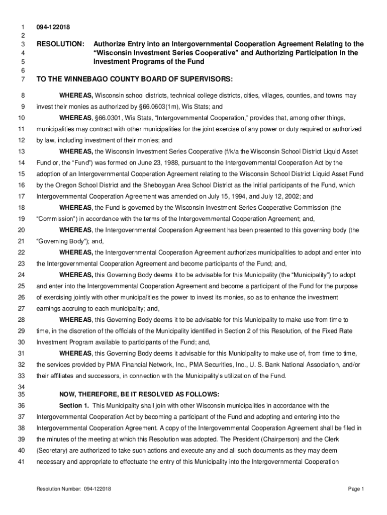 1 2 3 4 5 6 7 8 9 10094122018RESOLUTION:Authorize Entry into an Intergovernmental Cooperation Agreement Relating to the Wisconsin Investment Series Cooperative and Authorizing Participation in the