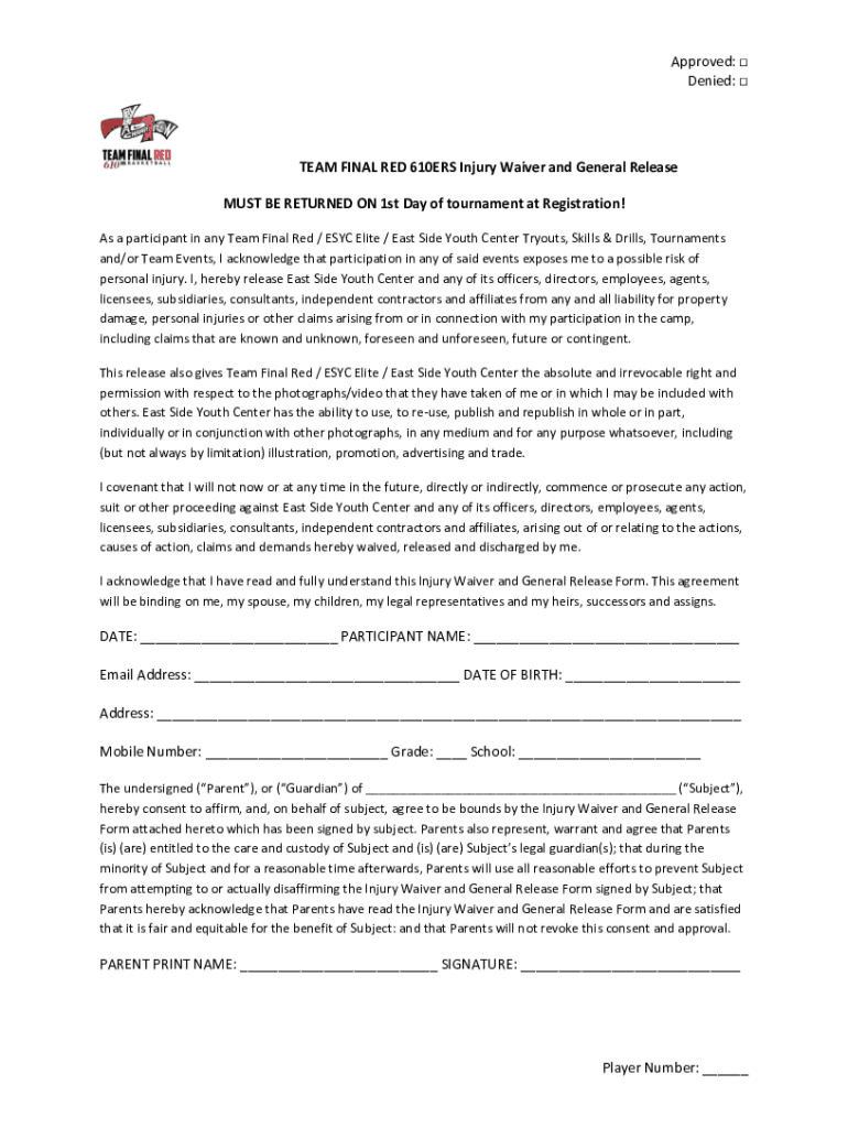 Approved: Denied: TEAM FINAL RED 610ERS Injury Waiver and General Release MUST BE RETURNED ON 1st Day of tournament at Registration! As a participant in any Team Final Red / ESC Elite / East Side