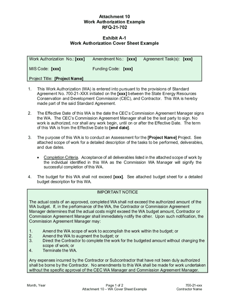 Attachment 10 Work Authorization Example RFQ21702 Exhibit A1 Work Authorization Cover Sheet Example Work Authorization No.: [xxx]Amendment No.: [xxx]MIS Code: [xxx]Funding Code: [xxx]Agreement Task(s):