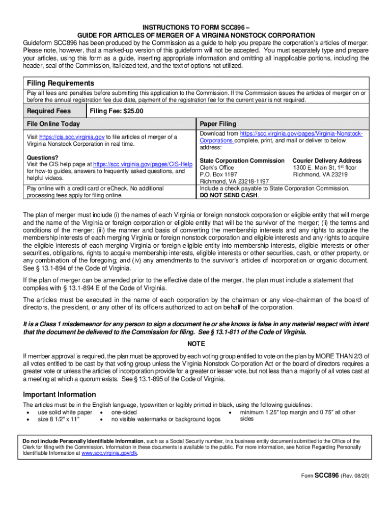 INSTRUCTIONS TO FORM SCC896 GUIDE FOR ARTICLES OF MERGER OF A VIRGINIA NONSTICK CORPORATION Guide form SCC896 has been produced by the Commission as a guide to help you prepare the corporations articles