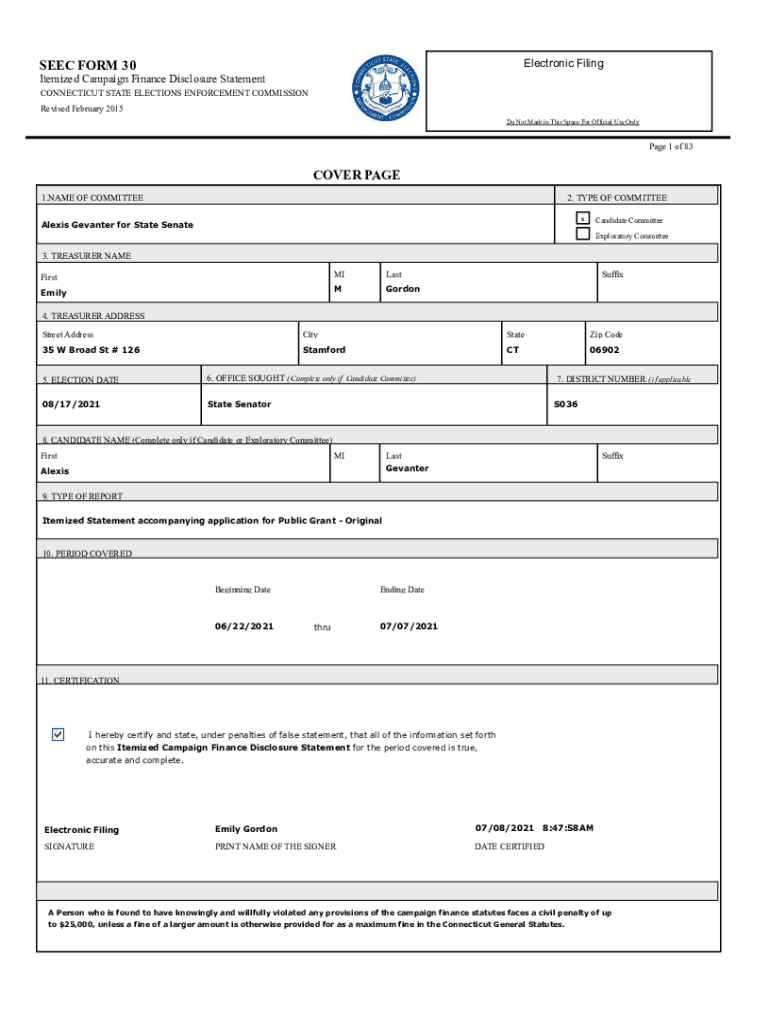 Electronic Filings EEC FORM 30Itemized Campaign Finance Disclosure Statement CONNECTICUT STATE ELECTIONS ENFORCEMENT COMMISSION Revised February 2015 Do Not Mark in This Space For Official Use Only