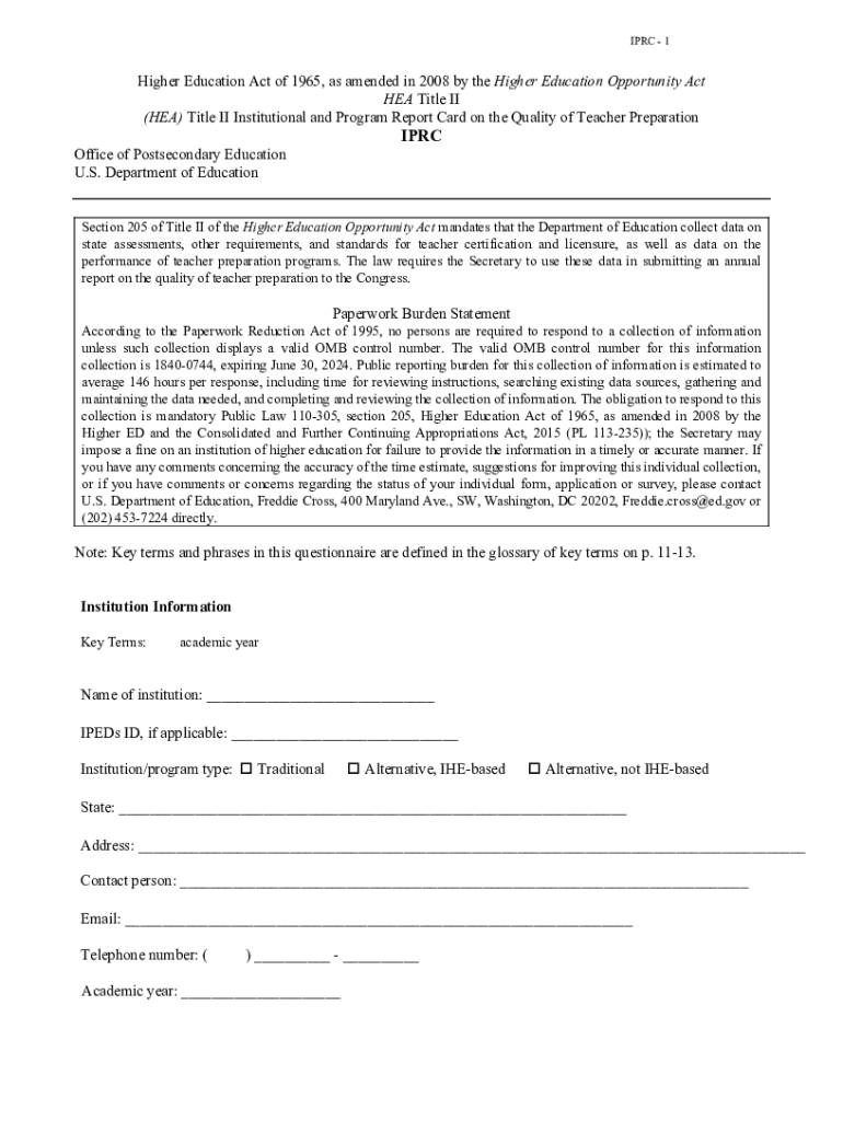 PRC 1Higher Education Act of 1965, as amended in 2008 by the Higher Education Opportunity Act HE Title II (HE) Title II Institutional and Program Report Card on the Quality of Teacher PreparationIPRCOffice