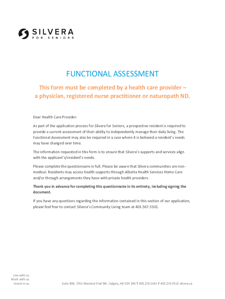 FUNCTIONAL ASSESSMENT This form must be completed by a health care provider a physician, registered nurse practitioner or naturopath ND. Dear Health Care Provider: As part of the application process