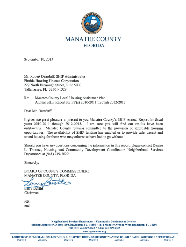 MANATEE COUNTY FLORIDA September 10, 2013Mr. Robert Dear duff, SHIP Administrator Florida Housing Finance Corporation 227 North Brought Street, Suite 5000 Tallahassee, FL 323 0113 29 Re:Manatee County