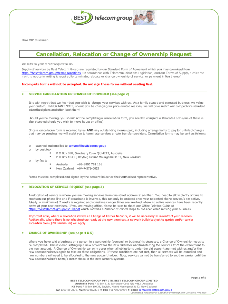 Dear VIP Customer, Cancellation, Relocation or Change of Ownership Request We refer to your recent request to us. Supply of services by Best Telecom Group are regulated by our Standard Form of Agreement