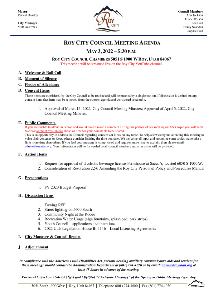 Mayor Robert DandoyCouncil Members Ann Jackson Diane Wilson Joe Paul Randy Sadden Sophie Paucity Manager Matt Andrews CITY COUNCIL MEETING AGENDA MAY 3, 2022 5:30 P.M. ROY CITY COUNCIL CHAMBERS 5051