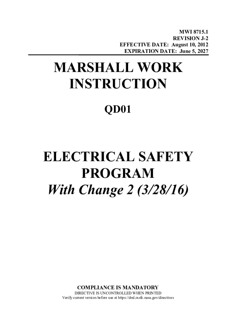MRI 8715.1 REVISION J2 EFFECTIVE DATE: August 10, 2012, EXPIRATION DATE: June 5, 2027MARSHALL WORK INSTRUCTION QD01ELECTRICAL SAFETY PROGRAM With Change 2 (3/28/16)COMPLIANCE IS MANDATORYDIRECTIVE