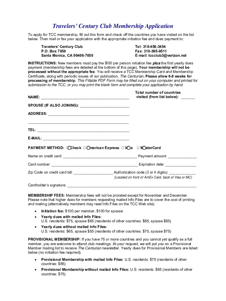 Travelers\' Century Club Membership Application To apply for TCC membership, fill out this form and check off the countries you have visited on the list below. Then mail or fax your application with
