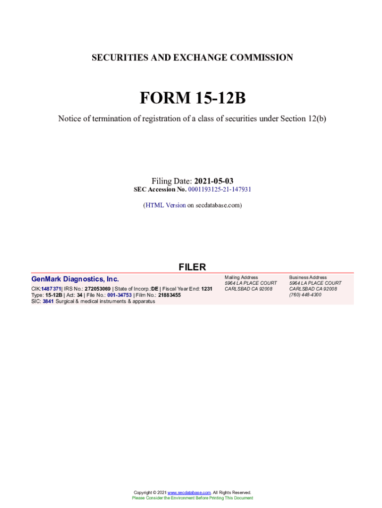 Get the free GenMark Diagnostics, Inc. Form 15-12B Filed 2021-05-03. Accession Number