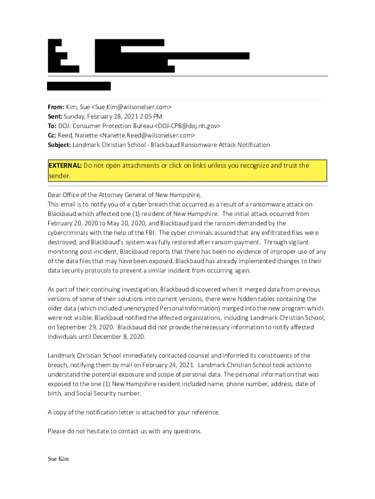 From: Kim, Sue Sue.Kim@wilsonelser.com Sent: Sunday, February 28, 2021 2:05 PM To: DOJ: Consumer Protection Bureau DOJCPB@doj.nh.gov Cc: Reed, Nanette Nanette.Reed@wilsonelser.com Subject: Landmark