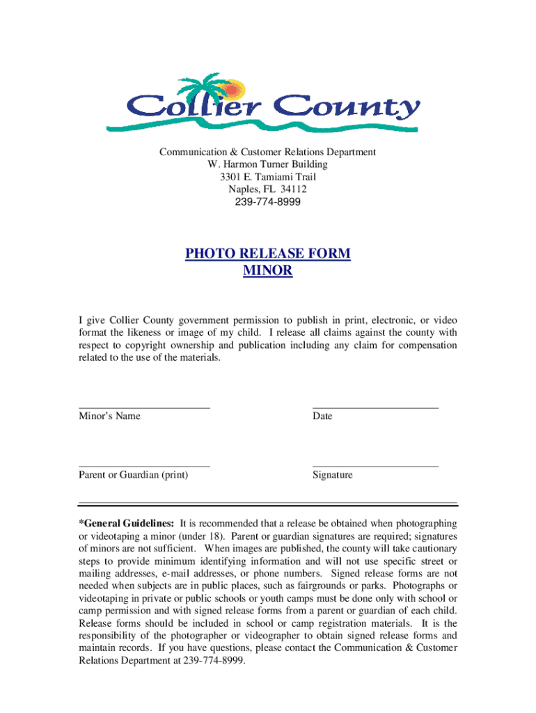 Communication & Customer Relations Department W. Harmon Turner Building 3301 E. Tamiami Trail Naples, FL 34112 2397748999PHOTO RELEASE FORM MINOR give Collier County government permission to publish