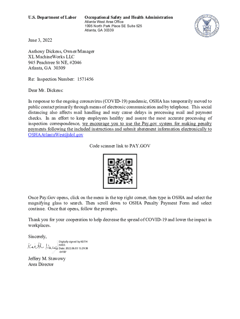 U.S. Department of LaborOccupational Safety and Health Administration Atlanta West Area Office 1995 North Park Place SE Suite 525 Atlanta, GA 30339June 3, 2022 Anthony Dickens, Owner/Manager XL MachineWorks