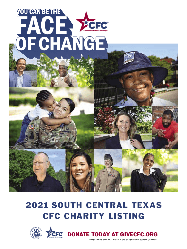2021 SOUTH CENTRAL TEXAS CFC CHARITY LISTING DONATE TODAY AT GIVE CFC.ORG HOSTED BY THE U.S. OFFICE OF PERSONNEL MANAGEMENTDear Federal, Military and Postal Employees, and Retirees, We are honored