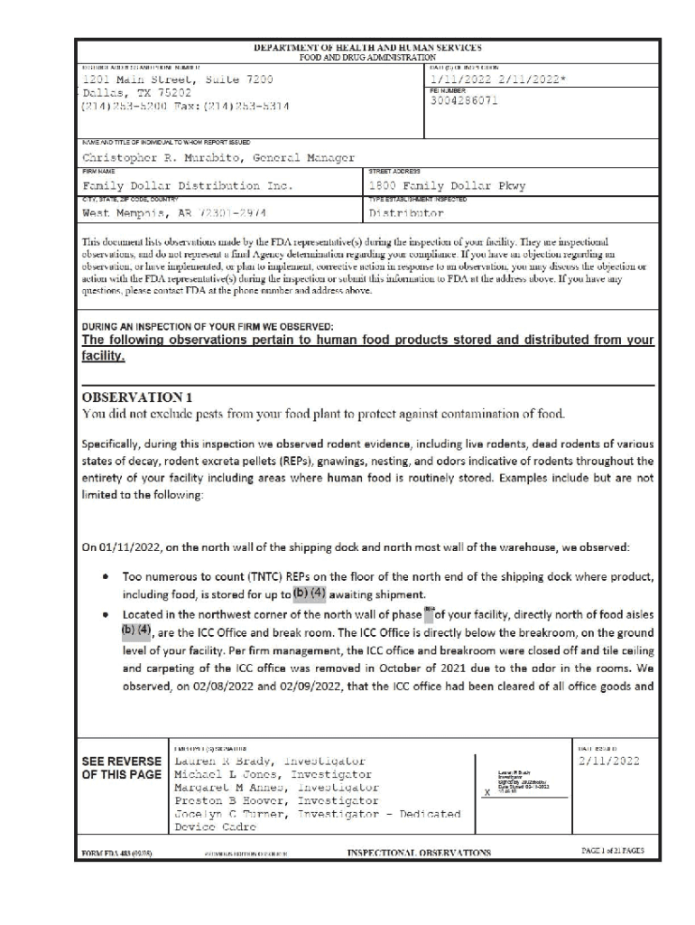 DEPARTMENT OF HEALTH AND HUMAN SERVICES FOOD AND DRUG ADMINISTRATION DI STRICT ADDRESS ANO PHONE NUMERATE(S) OF INSPECTION1 20 1 Main Street, Suite 7200 Dallas, TX 75202 (214)253 5200 Fax: (214)253
