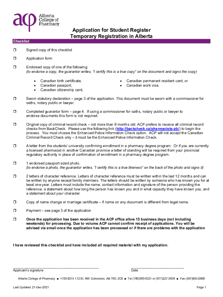 Application for Student Register Temporary Registration in Alberta Checklist Signed copy of this checklistApplication formEndorsed copy of one of the following: (to endorse a copy, the guarantor writes,
