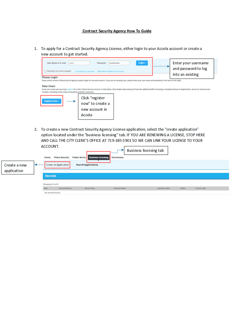 Contract Security Agency How To Guide1. To apply for a Contract Security Agency License, either login to your Accela account or create a new account to get started. Enter your username and password