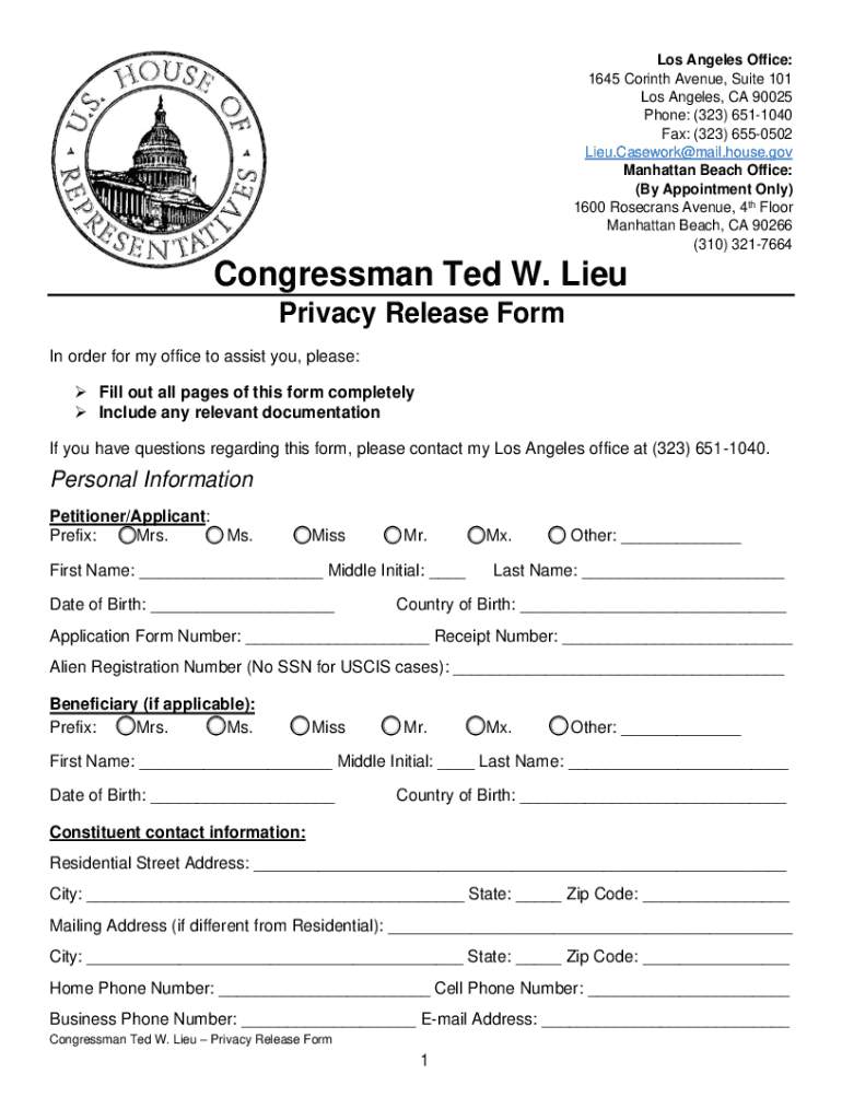 Los Angeles Office: 1645 Corinth Avenue, Suite 101 Los Angeles, CA 90025 Phone: (323) 6511040 Fax: (323) 6550502 Lieu.Casework@mail.house.gov Manhattan Beach Office: (By Appointment Only) 1600 Rosecrans