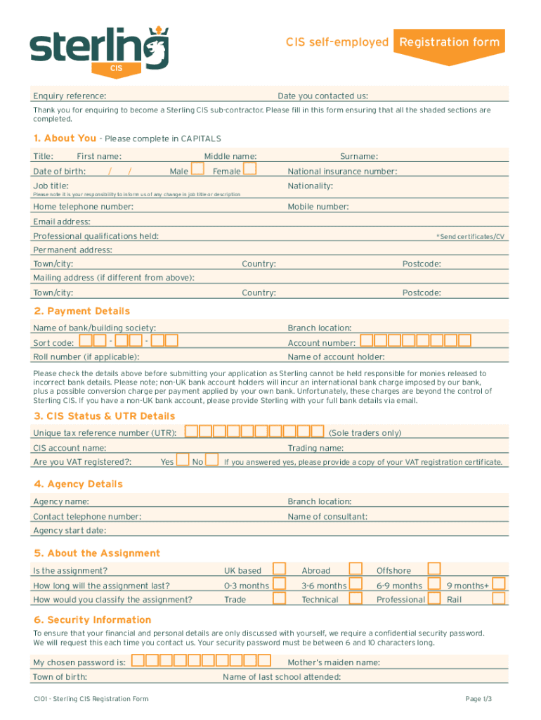 CIS self-employed Registration formEnquiry reference:Date you contacted us:Thank you for inquiring to become a Sterling CIS subcontractor. Please fill in this form ensuring that all the shaded sections