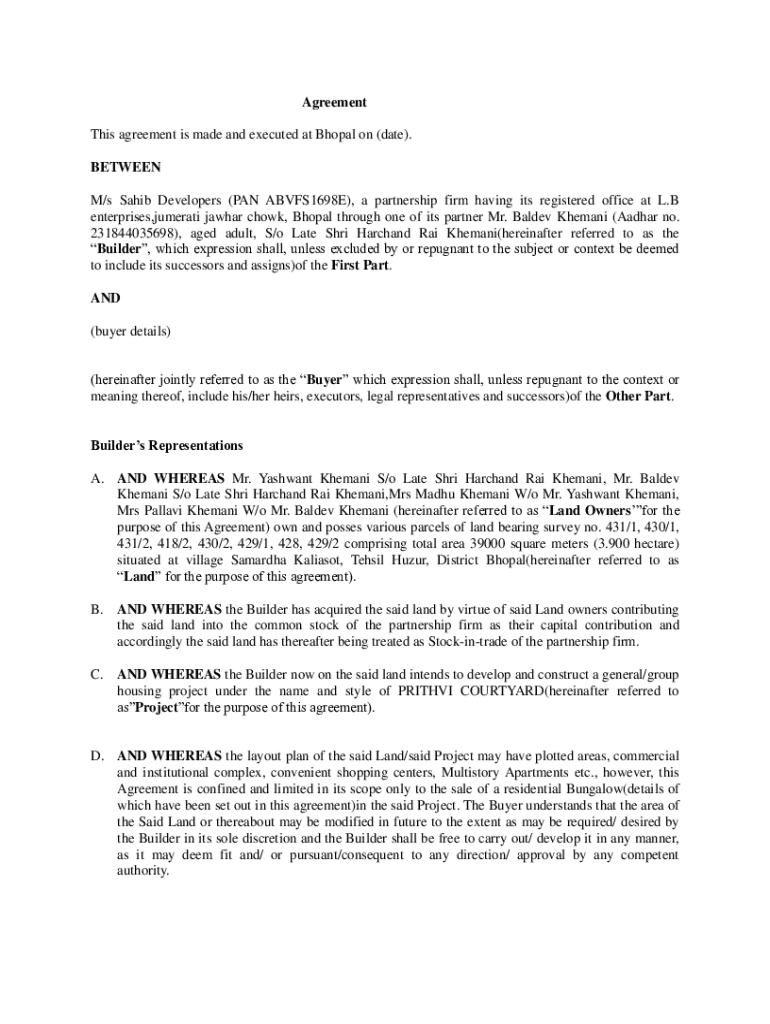 Agreement This agreement is made and executed at Bhopal on (date). BETWEEN M/s Sahib Developers (PAN ABVFS1698E), a partnership firm having its registered office at L. B enterprises, numerate Jaguar