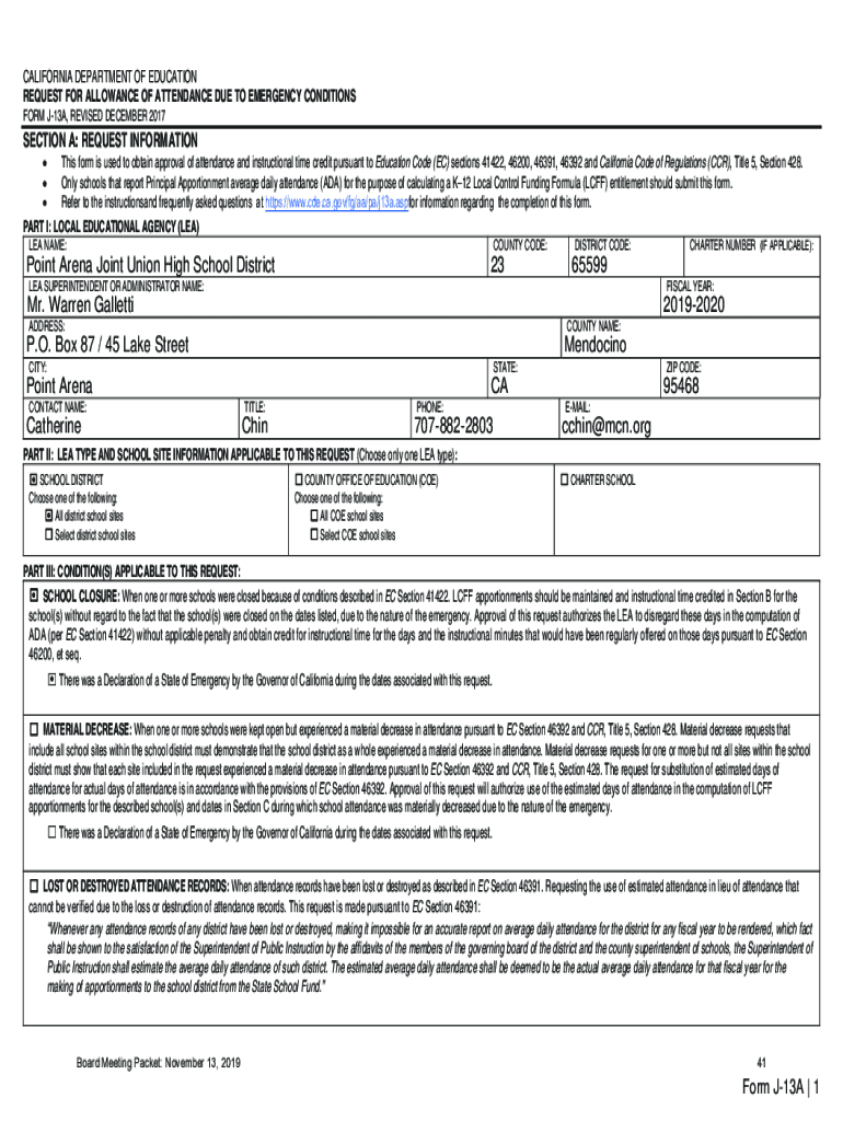 CALIFORNIA DEPARTMENT OF EDUCATION REQUEST FOR ALLOWANCE OF ATTENDANCE DUE TO EMERGENCY CONDITIONS FORM J13A, REVISED DECEMBER 2017SECTION A: REQUEST INFORMATION This form is used to obtain approval