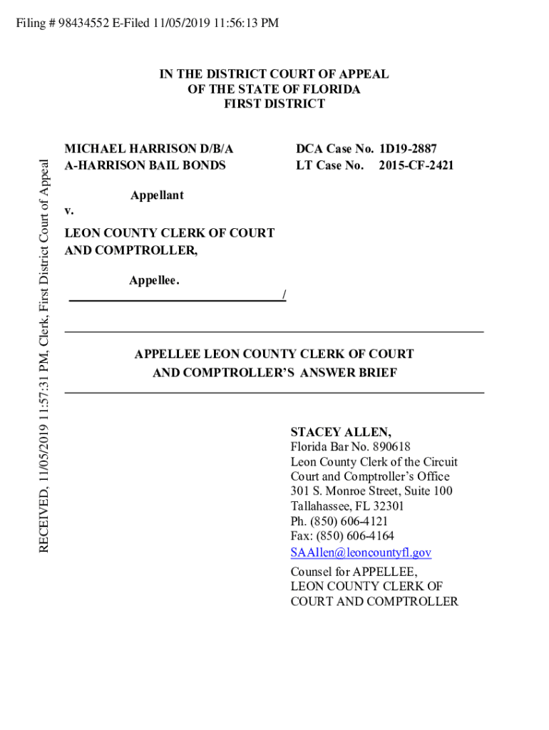 Filing # 98434552 Filed 11/05/2019 11:56:13 RECEIVED, 11/05/2019 11:57:31 PM, Clerk, First District Court of Appealing THE DISTRICT COURT OF APPEAL OF THE STATE OF FLORIDA FIRST DISTRICT MICHAEL HARRISON