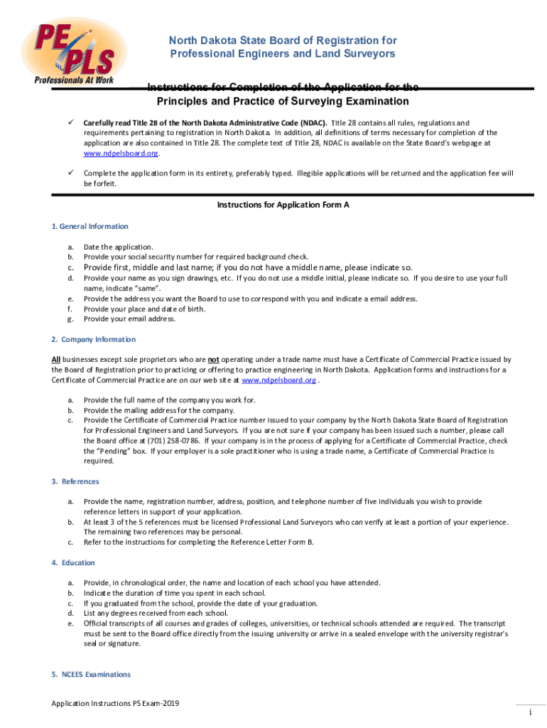 North Dakota State Board of Registration for Professional Engineers and Land Surveyors Instructions for Completion of the Application for the Principles and Practice of Surveying Examination Carefully