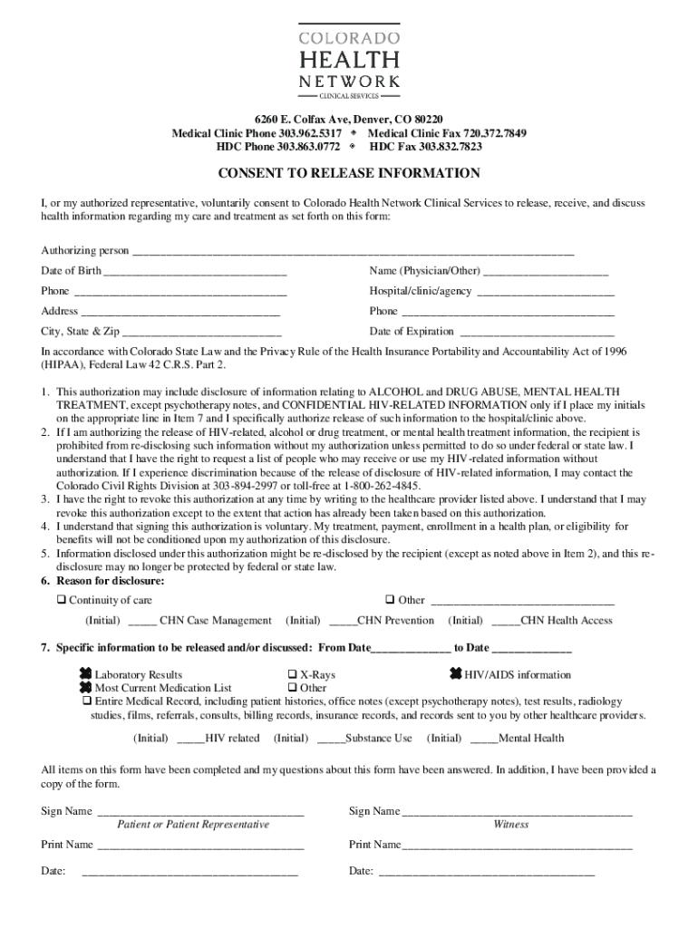 6260 E. Colfax Ave, Denver, CO 80220 Medical Clinic Phone 303.962.5317 Medical Clinic Fax 720.372.7849 HD Phone 303.863.0772 HD Fax 303.832.7823CONSENT TO RELEASE INFORMATION I, or my authorized representative,