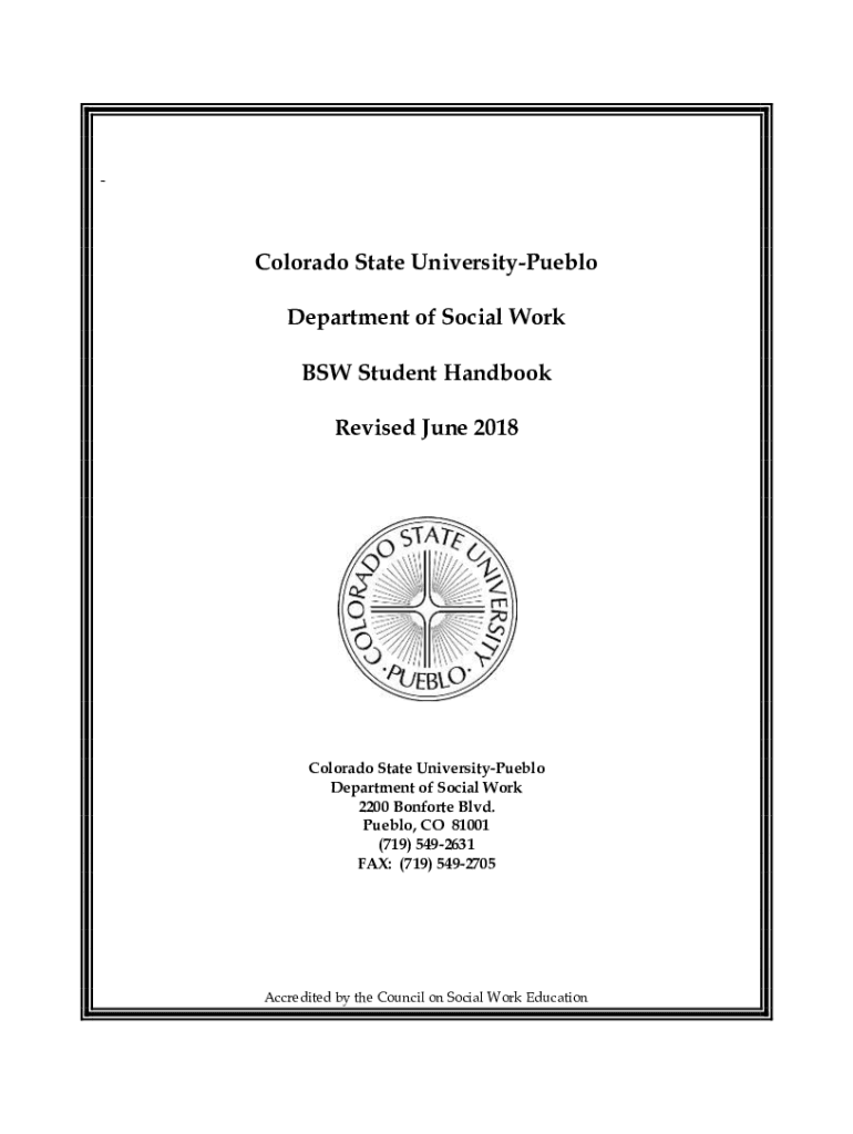 Colorado State University Pueblo Department of Social Work BSW Student Handbook Revised June 2018Colorado State University Pueblo Department of Social Work 2200 Bonfire Blvd. Pueblo, CO 81001 (719)