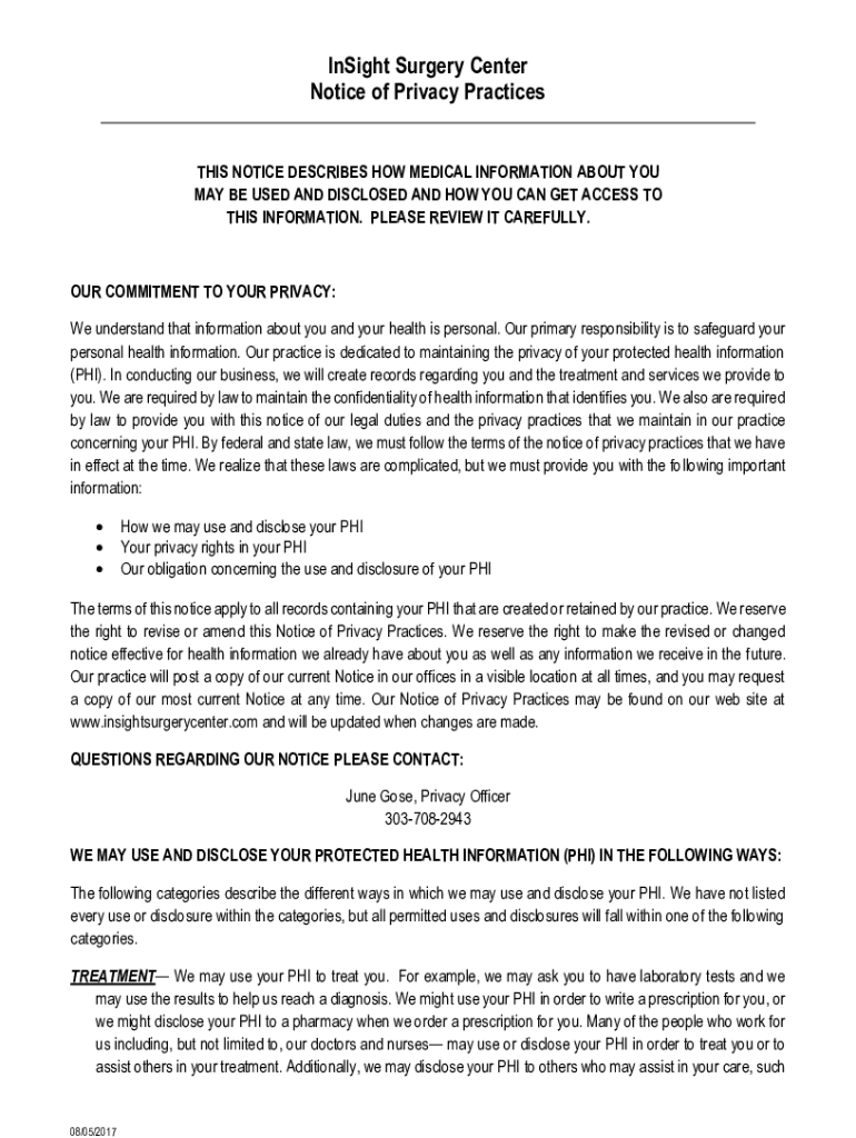 Insight Surgery Center Notice of Privacy Practices THIS NOTICE DESCRIBES HOW MEDICAL INFORMATION ABOUT YOU MAY BE USED AND DISCLOSED AND HOW YOU CAN GET ACCESS TO THIS INFORMATION. PLEASE REVIEW IT