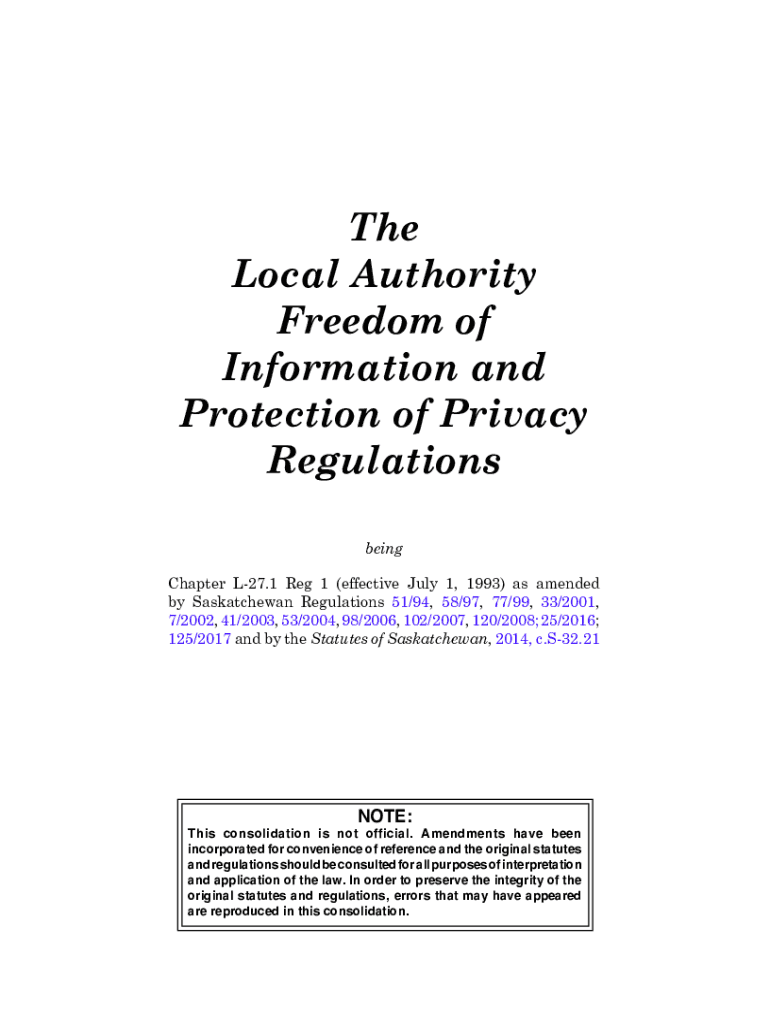 1LOCAL AUTHORITY FREEDOM OF INFORMATION AND PROTECTION OF PRIVACYL27.1 REG 1The Local Authority Freedom of Information and Protection of Privacy Regulations being Chapter L27.1 Reg 1 (effective July