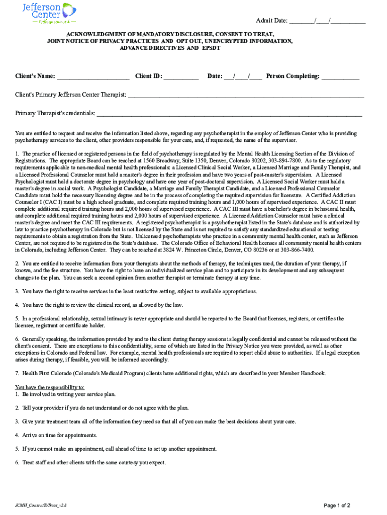 Admit Date: ___/___/___ ACKNOWLEDGMENT OF MANDATORY DISCLOSURE, CONSENT TO TREAT, JOINT NOTICE OF PRIVACY PRACTICES AND OPT OUT, UNENCRYPTED INFORMATION, ADVANCE DIRECTIVES AND EPSDTClient\'s Name: