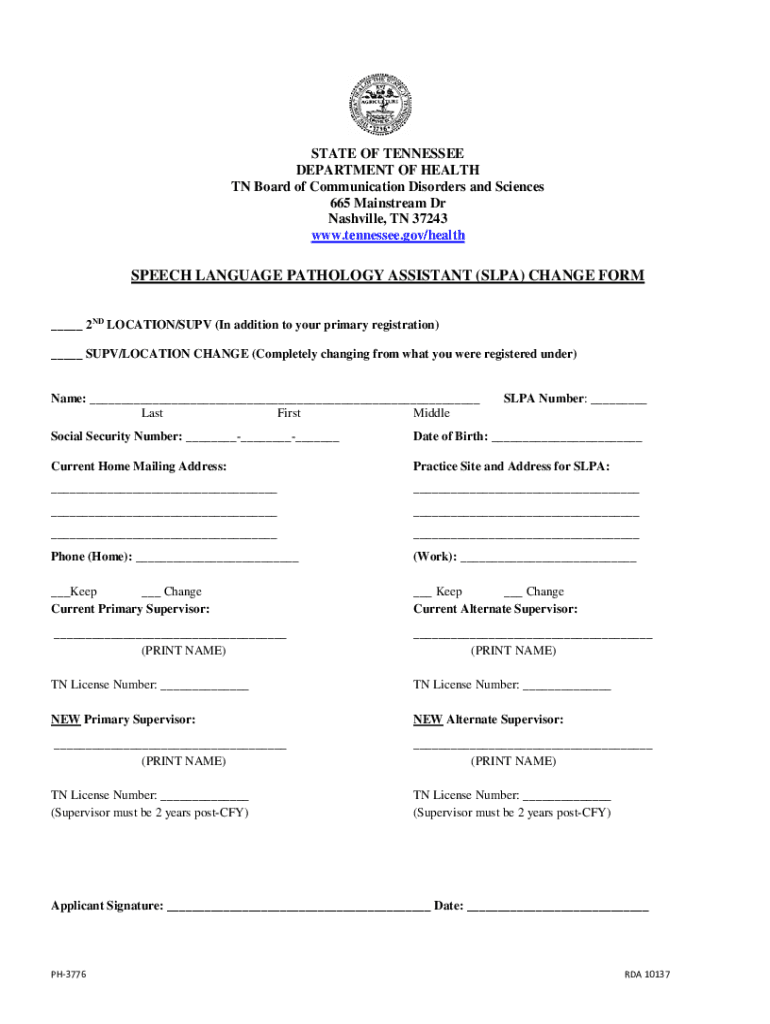 STATE OF TENNESSEE DEPARTMENT OF HEALTH TN Board of Communication Disorders and Sciences 665 Mainstream Dr Nashville, TN 37243 www.tennessee.gov/healthSPEECH LANGUAGE PATHOLOGY ASSISTANT (SPA) CHANGE