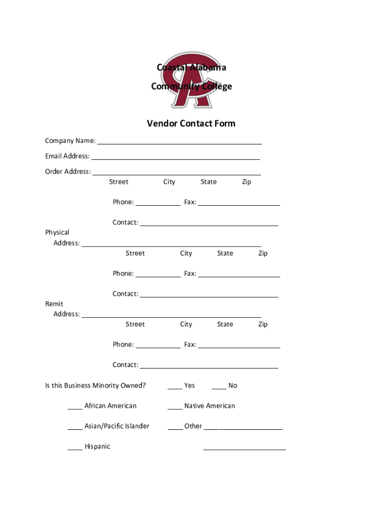 Coastal Alabama Community College Vendor Contact Form Company Name: ___ Email Address: ___ Order Address: ___ Street City State Zip Phone: ___ Fax: ___ Contact: ___Physical Address: ___ Street City