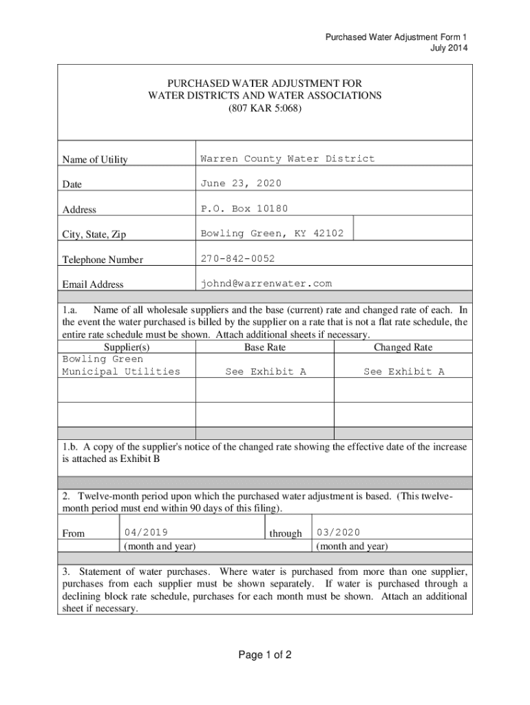 Purchased Water Adjustment Form 1 July 2014PURCHASED WATER ADJUSTMENT FOR WATER DISTRICTS AND WATER ASSOCIATIONS (807 Cars 5:068)Name of Utility Warren County Water DistrictDateJune 23, 2020AddressP.
