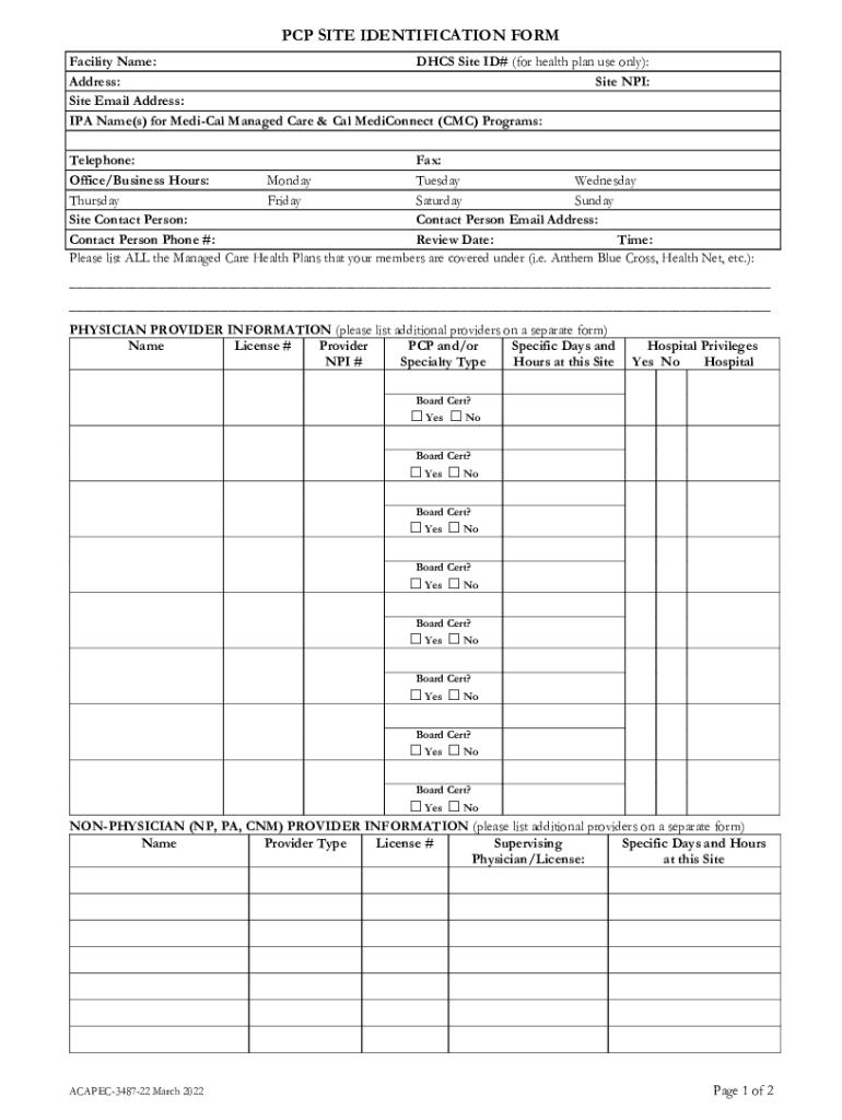 The pcp site identification form can be filled out by providing necessary information such as facility details, PCP implementation details, and contact information.