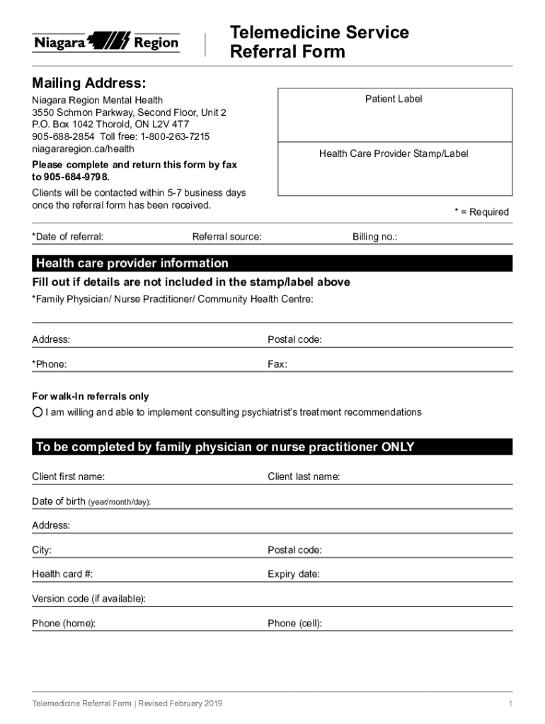Telemedicine Service ReferralForm Mailing Address:Patient Label Niagara Region Mental Health 3550 Schmo Parkway, Second Floor, Unit 2 P.O. Box 1042 Thor old, ON L2V 4T7 9056882854 Toll free: 18002637215