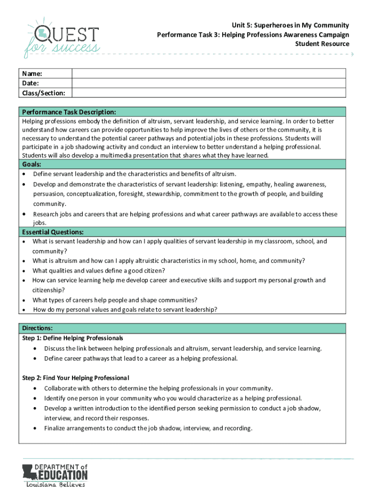 Unit 5: Superheroes in My Community Performance Task 3: Helping Professions Awareness Campaign Student ResourceName: Date: Class/Section: Performance Task Description: Helping professions embody the