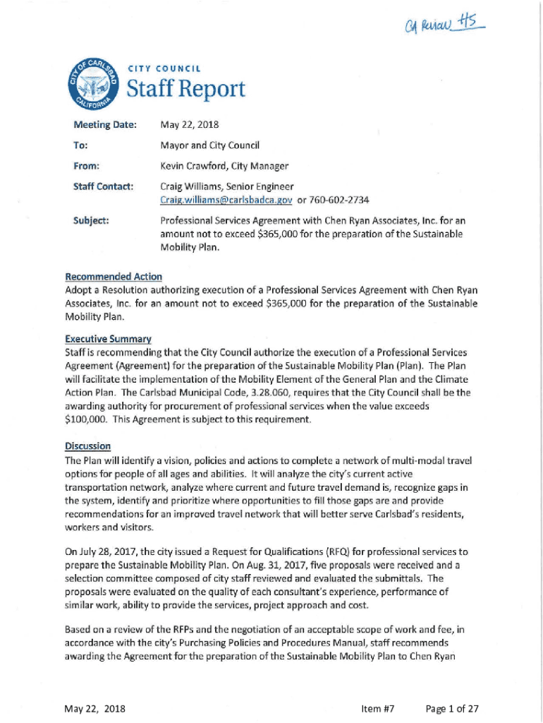 CITY COUNCILStaff ReportMeeting Date:May 22, 2018To:Mayor and City Councilor:Kevin Crawford, City ManagerStaff Contact:Craig Williams, Senior Engineer Craig. William s@carlsbadca.gov or 7606022734Subject:Professional