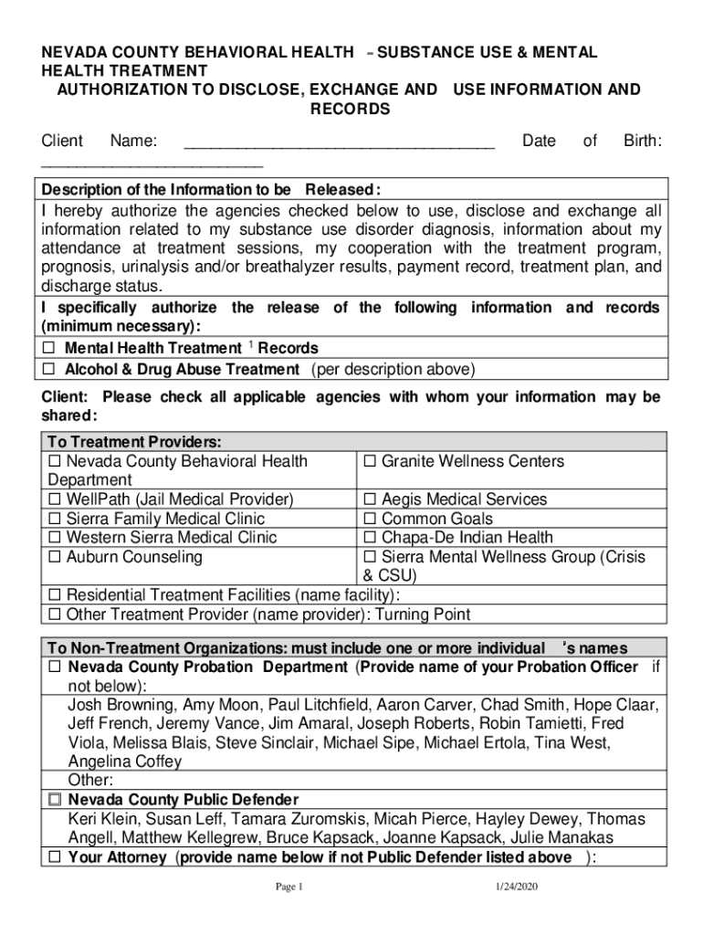 NEVADA COUNTY BEHAVIORAL HEALTH SUBSTANCE USE & MENTAL HEALTH TREATMENT AUTHORIZATION TO DISCLOSE, EXCHANGE AND USE INFORMATION AND RECORDS Client Name: ___ ___DateofBirth:Description of the Information