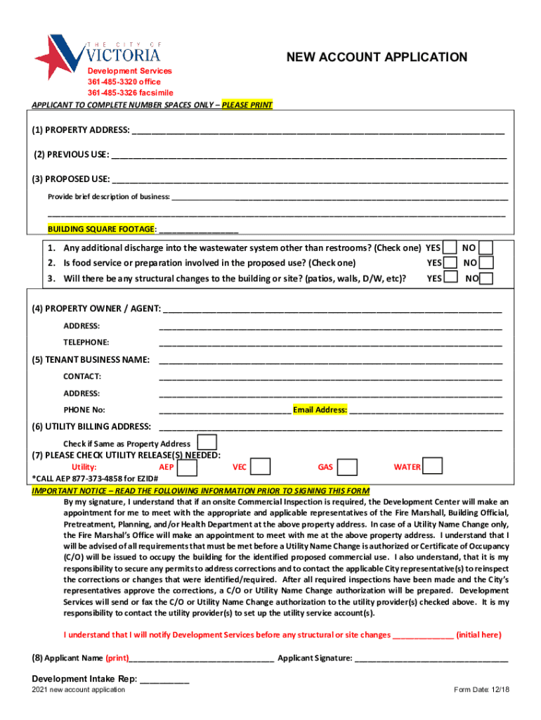 Development Services 3614853320 office 3614853326 facsimile ACCOUNT APPLICATIONAPPLICANT TO COMPLETE NUMBER SPACES ONLY PLEASE PRINT(1) PROPERTY ADDRESS: ___ (2) PREVIOUS USE: ___ (3) PROPOSED USE: