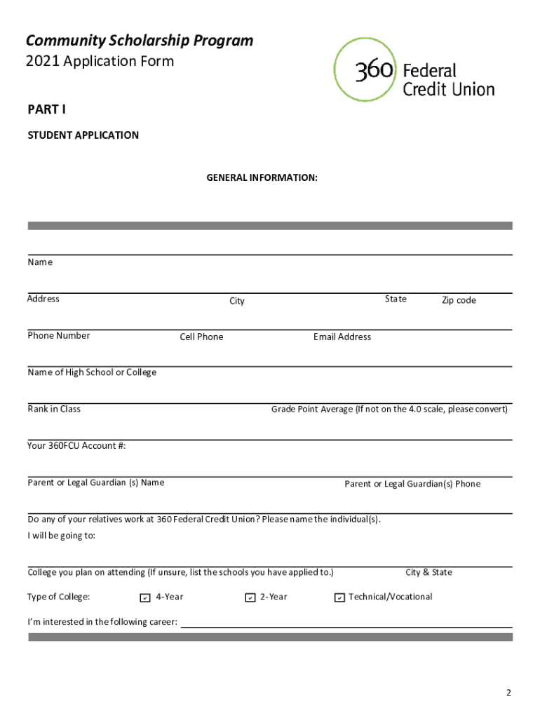 Community Scholarship Program 2021 Application Form Guidelines & Applicant Criteria Mission of Scholarship Program: 360 Federal Credit Union is committed to helping our members achieve lifelong success