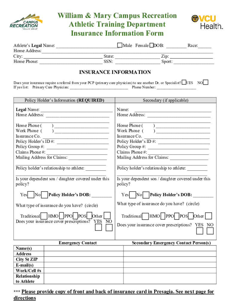 William & Mary Campus Recreation Athletic Training Department Insurance Information Form Athletes Legal Name: ___ Male Female DOB: ___ Race:___ Home Address:___ City: ___ State: ___ Zip: ___ Home