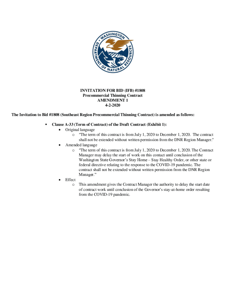 INVITATION FOR BID (IF) #1808 Commercial Thinning Contract AMENDMENT 1 422020 The Invitation to Bid #1808 (Southeast Region Commercial Thinning Contract) is amended as follows: Clause A33 (Term of